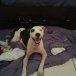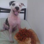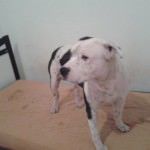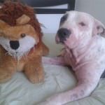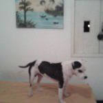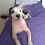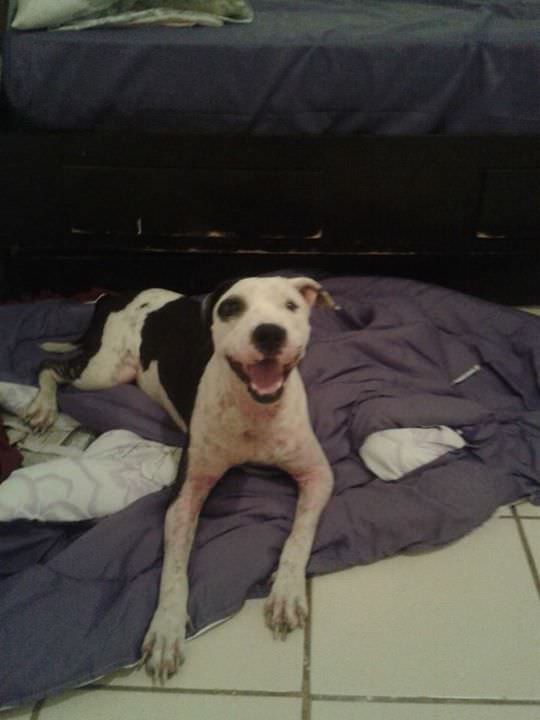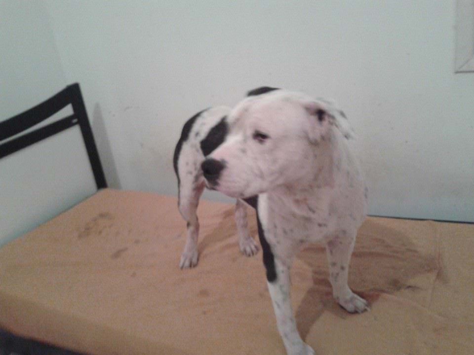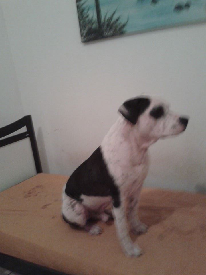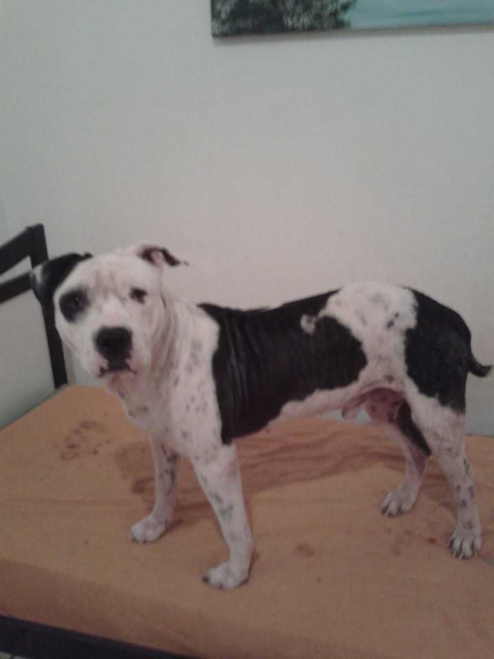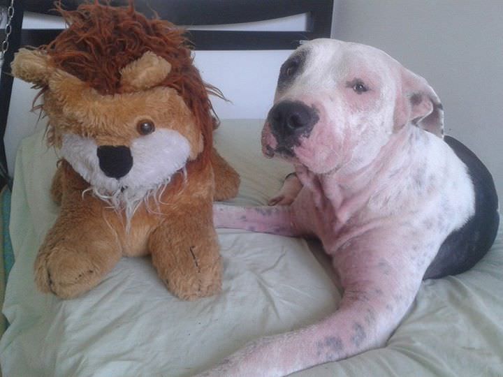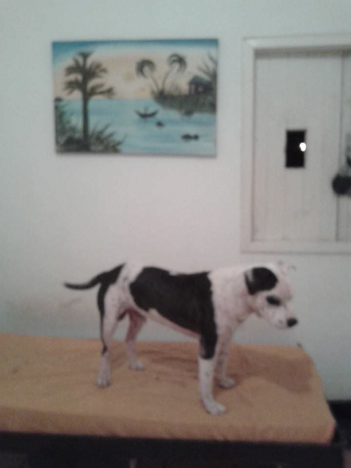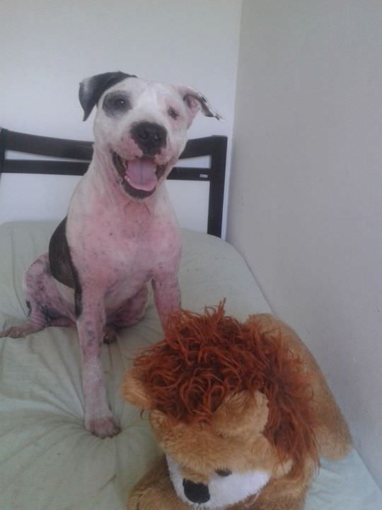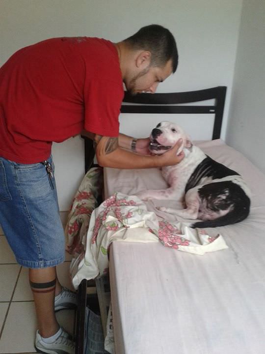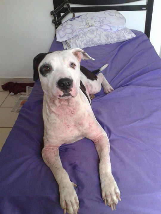 Apanhou muito na rua, por conta do preconceito das pessoas com sua raça.Estava com muita sarna, mas passou por um tratamento intensivo e hoje está 100%.