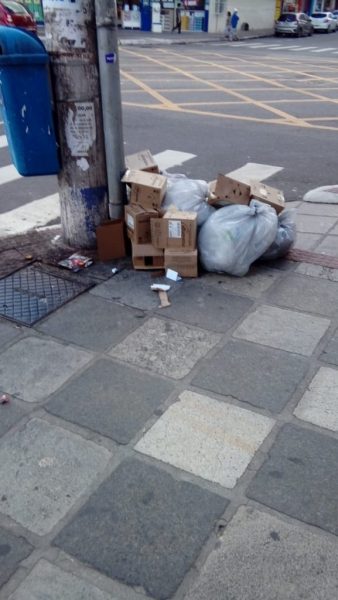 No cruzamento com a Avenida Norte Sul, por exemplo, havia bastante lixo ao ar livre, fora das sacolas, em disputa por espaço com o vai-e-vem incessante dos pedestres.