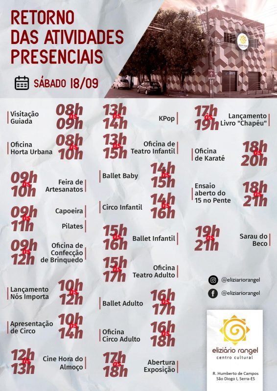 O Centro Cultural Eliziário Rangel, em São Diogo, na Serra vai retomar depois de quase dois anos com suas atividades presenciais. As agendas do local estavam sendo promovidas no modelo on-line, por conta da pandemia da Covid-19.
