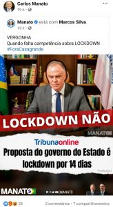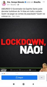 Ainda assim os políticos e médicos capixabas Carlos Manato e sua esposa Soraya Manato, ambos do PSL, estão fazendo campanha pelas redes sociais contra medidas mais duras de isolamento social. Ambos estão alinhados com o discurso do presidente Jair Bolsonaro (Sem partido), cuja postura na pandemia vêm gerando críticas no Brasil e fora dele. Tanto por minimizar o risco do vírus, quanto por não adquirir vacinas quando teve oportunidade, como também por gerar aglomerações, difundir uso de medicação sem comprovação científica contra a doença e desestimular o uso das máscaras. E já trocou quatro vezes o Ministro da Saúde.