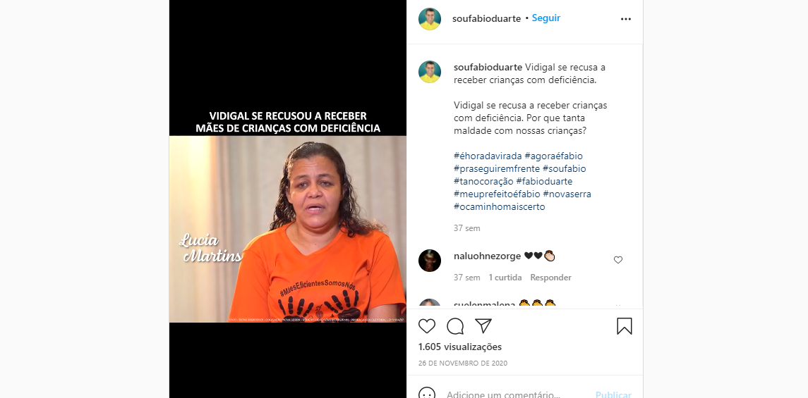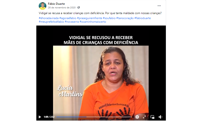 Entretanto, após a publicação da matéria, a reportagem recebeu vídeos e fotos de Lúcia participando da campanha política de 2020, no palanque do então candidato Fábio Duarte, que foi apadrinhado pelo ex-prefeito Audifax Barcelos, que é adversário do atual prefeito Sérgio Vidigal. Inclusive os vídeos contendo a manifestante foram publicados na Facebook e no Instagram do então candidato Fábio Duarte durante a reta final do 2º turno da campanha.