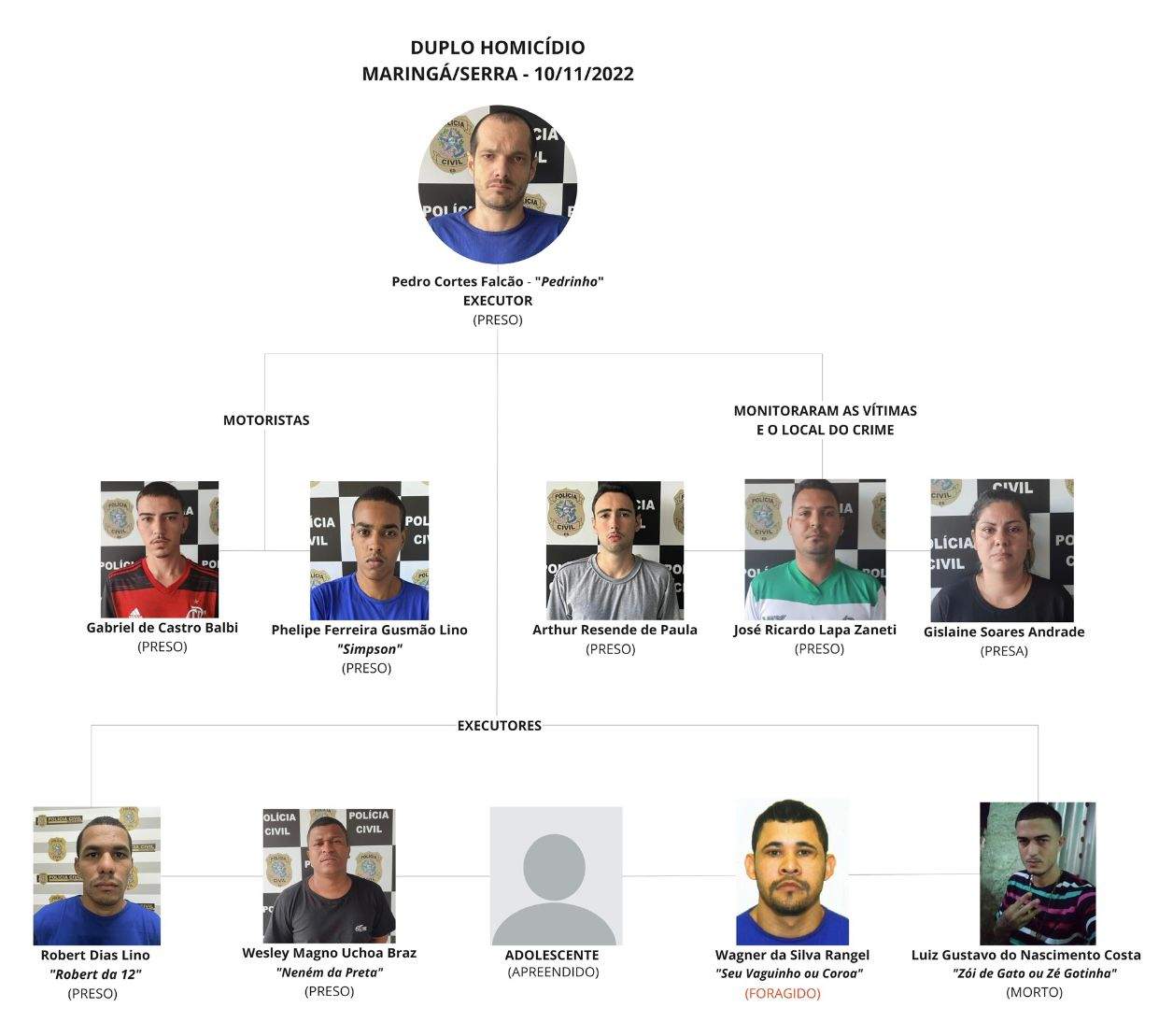 Um grupo de onze indivíduos, composto por um adolescente de 17 anos, uma mulher e nove homens, está ligado à execução de um casal que sofreu 75 disparos em novembro de 2022, no bairro Maringá, na Serra. Durante o crime, a filha do casal, uma menina de 6 anos, foi retirada do quarto pelos agressores e deixada vagando pelas ruas.
