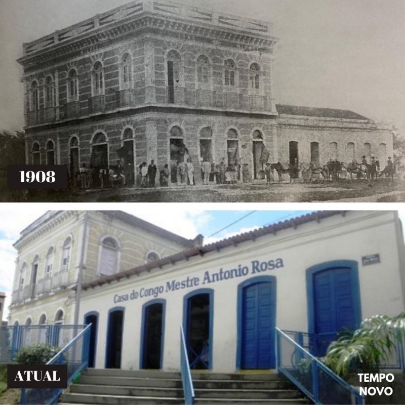 Foto 05 – A fotografia foi tirada por ocasião da inauguração do recém-construído prédio-, iniciado em 1905 – situado onde é a atual praça, que também leva o nome do antigo proprietário, João Miguel. Sendo uma das mais representativas edificações do inicio do século XX, era considerada um aspecto moderno da cidade. À direita, encontra-se o casarão do século XIX que abriga a atual Casa do Congo Mestre Antônio Rosa, em Serra Sede.