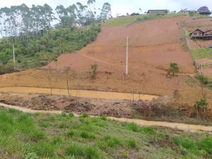 Cortes nos morros para todo lado, florestas derrubadas, solo exposto em grandes extensões nas encostas,...