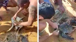 Duas tartarugas presas a rede de pesca foram salvas por banhistas numa praia da...