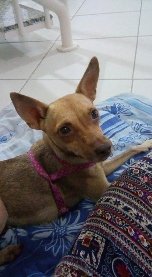 É porte pequeno – mestiça de pinscher, cerca de 5.4 quilos. Aproximadamente dois anos.