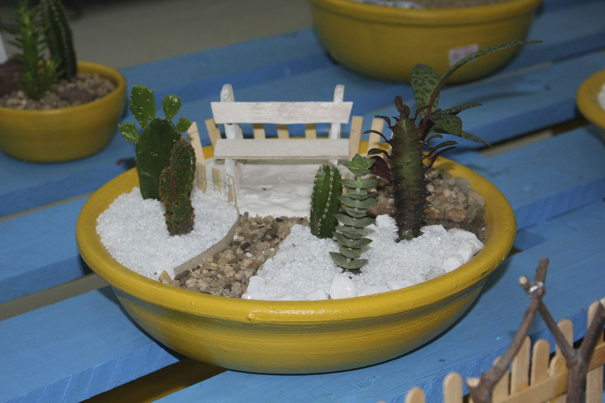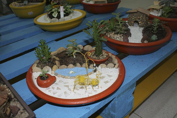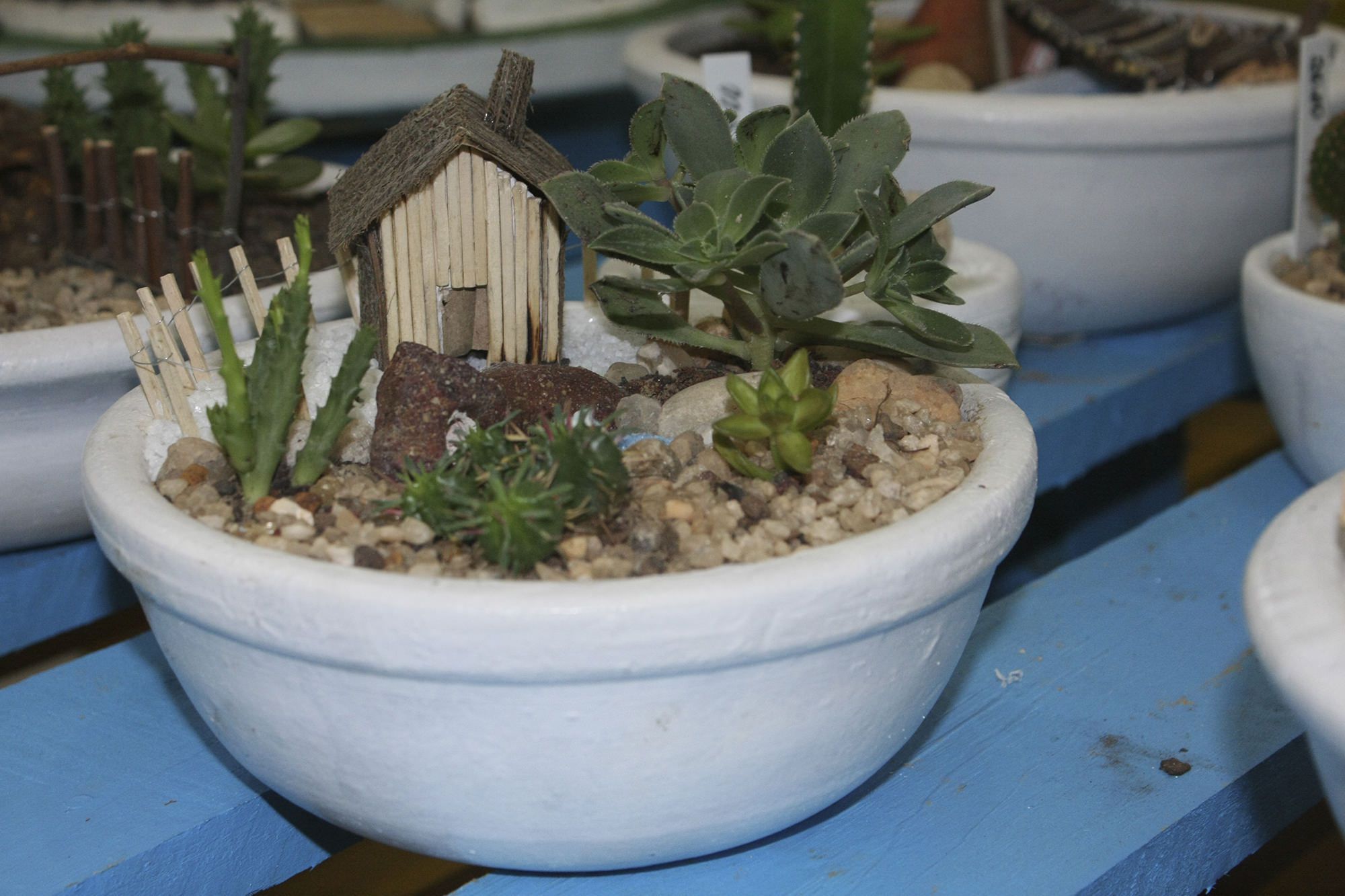As peças são pensadas e criadas por Aparecida, onde ela dedica tempo, carinho e amor a cada jardim produzido. “Todos os minijardins são feitos com várias espécies de plantas e materiais, dentre as plantas mais usadas estão os cactos e as suculentas”, destaca Carlos.