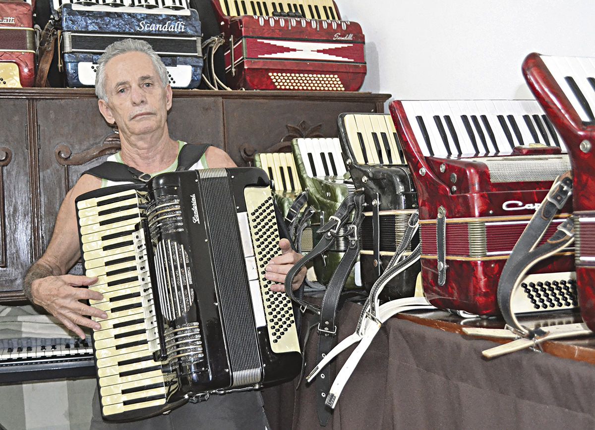 A oficina de Toninho também fica em Laranjeiras. Ele possui vinte acordeons, uma concertina e três teclados, todos para vender. Com um detalhe importante, todas são originais de fábricas como Scandalli, Sonelli, Minuano, Cantarini e Todeschini. “Tenho instrumentos com vinte, trinta anos de história, todos originais e únicos”, frisa.