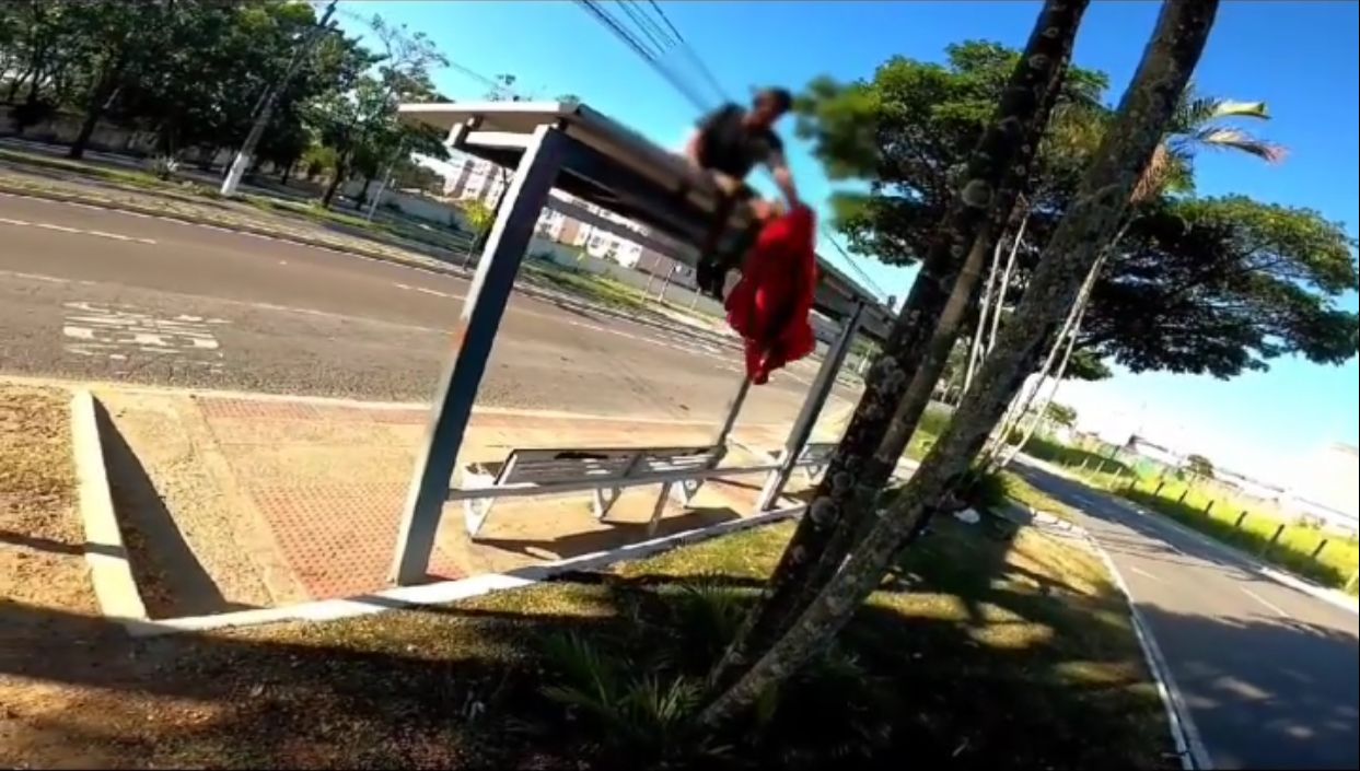 “Oh meu filho, bom dia, vamos descer daí? [Isso] é dano ao patrimônio público”, disse o agente. Em seguida, o morador de rua se explica e pede desculpas: “Bom dia senhor, [vou descer] agora. É porque toda vez que me deito embaixo, senhor [no banco do ponto de ônibus] eles roubam minha mochila, roubam minhas coisas”, explicou.