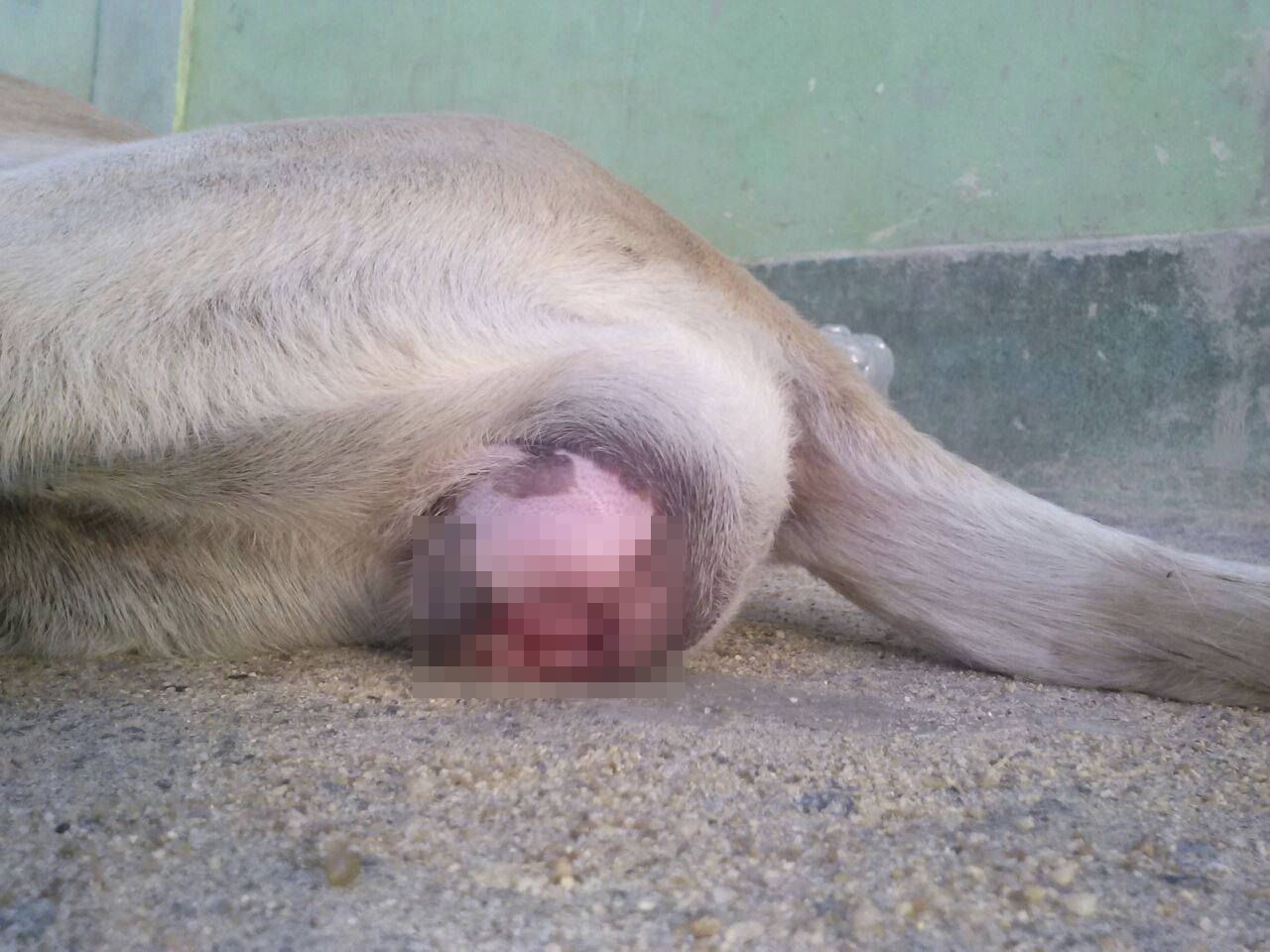 A cadela continua na rua e está com o útero saindo pela vagina. “Ela precisa de ajuda urgente”.