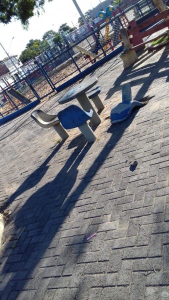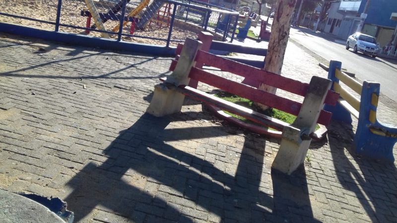 Mesas, bancos e cadeiras quebradas, falta de alambrado, parquinho sem manutenção e quadra sem pintura. Esta é a situação da praça do bairro Planalto Serrano, bloco C.