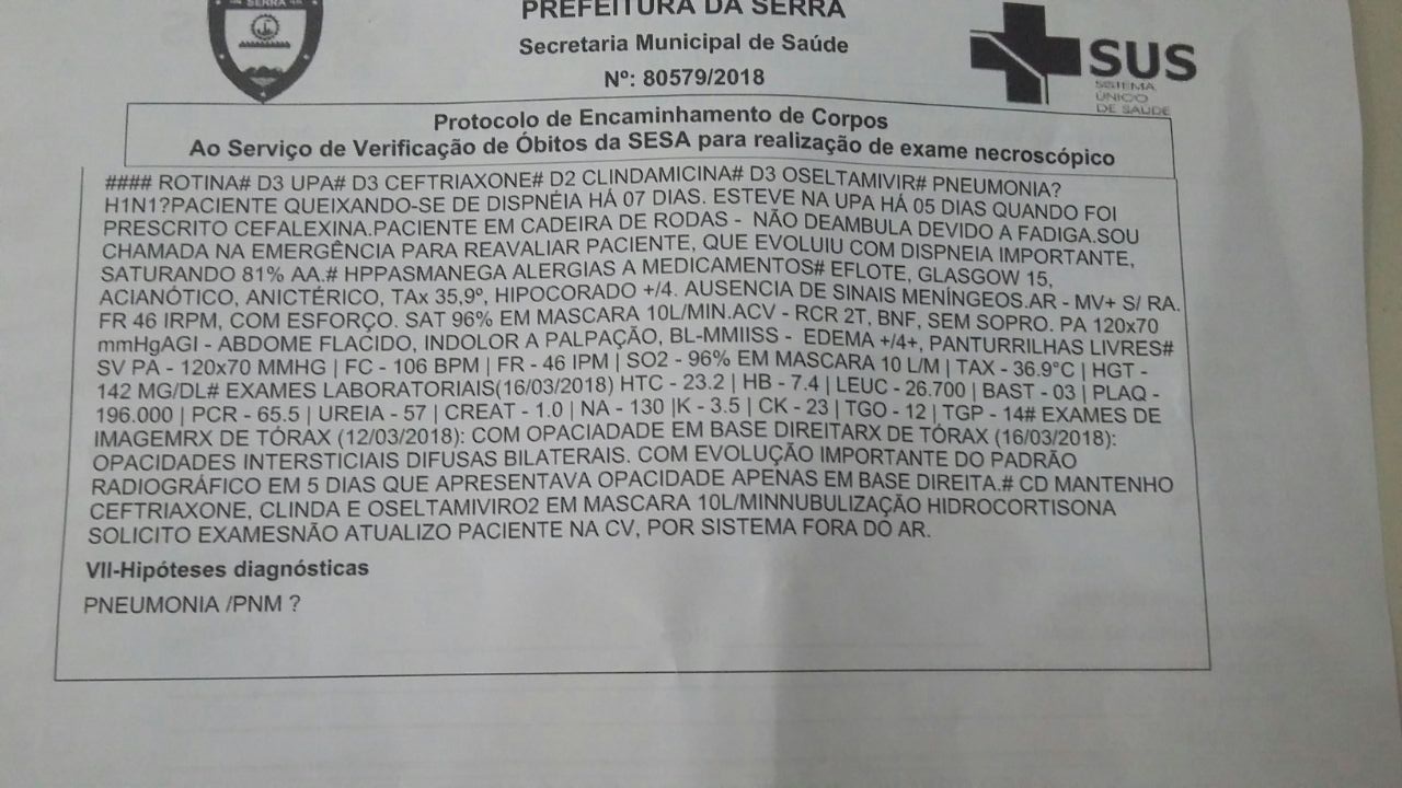 A reportagem teve acesso às informações do laudo encaminhado pela Upa ao Serviço de Vedrificação de Óbitos (SVO), conforme imagem no final da matéria.