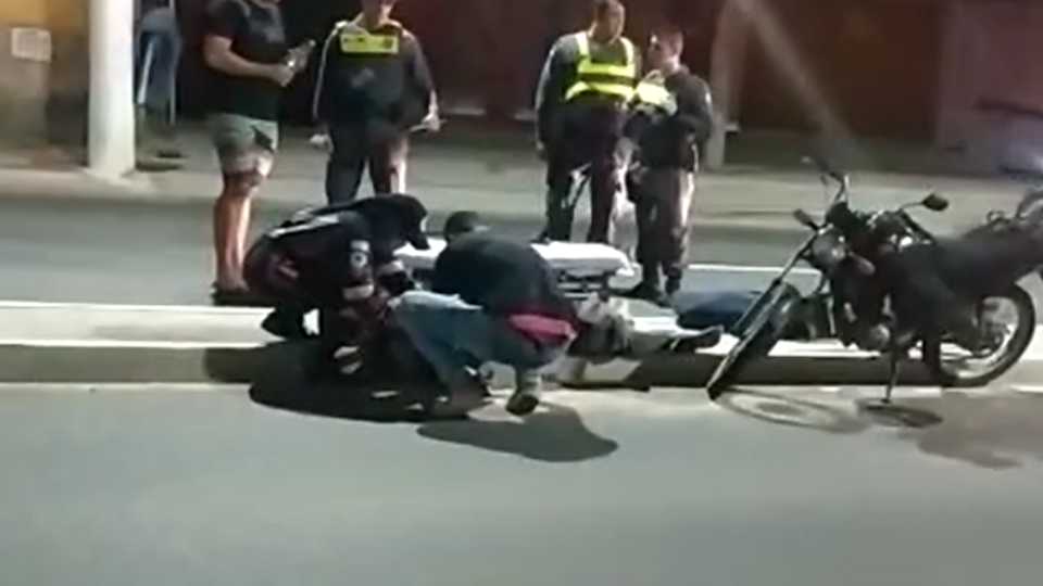 Por conta do impacto, o homem saltou da moto e foi parar em cima do canteiro central da via, metros a frente da colisão.