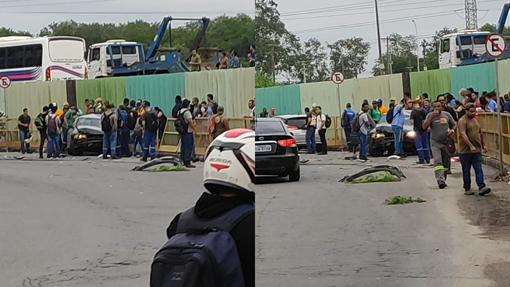 O carro acabou colidindo contra a grade de proteção que separa a pista da Avenida Norte Sul com a calçada da portaria da Vale, ao lado do Terminal de Carapina.