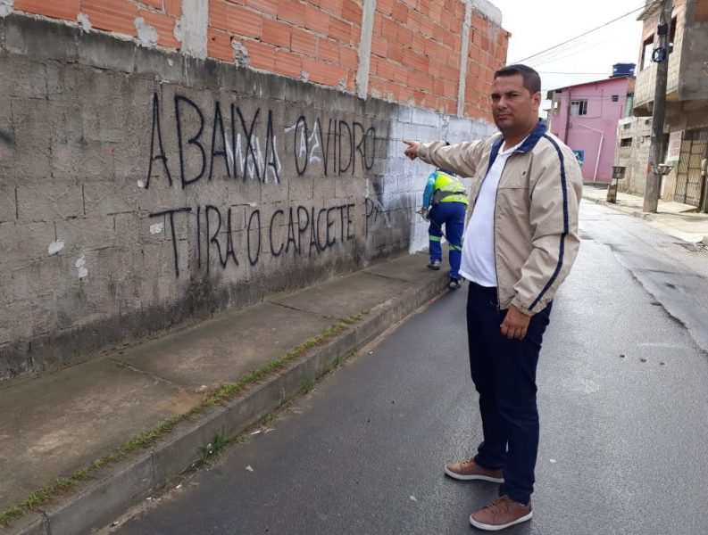 Após ameaçar um “traficante” e denunciar frases pichadas em um muro de uma escola municipal da região de Serra Sede, o vereador Cabo Porto (PSB) voltou ao local na manhã desta sexta-feira (07), juntamente com uma equipe da Prefeitura da Serra, para pintar o muro, que segundo o parlamentar tinha sido vandalizado com “regras do tráfico” por um “criminoso” do bairro Nossa Senhora da Conceição.
