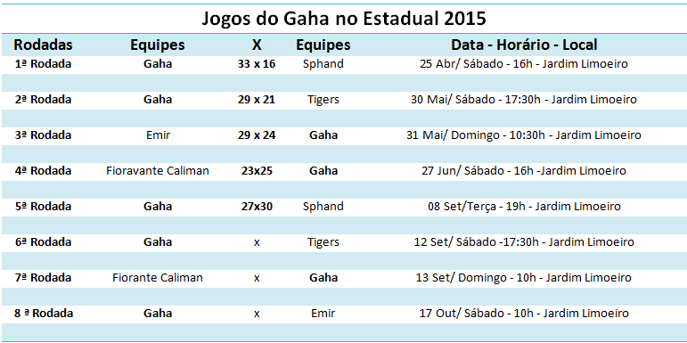 Agora o time do Gaha tem neste final de semana dois jogos determinantes na competição. Ambos os jogos acontecem no ginásio de Jardim Limoeiro. No sábado (12), às 17h30, o jogo é contra o Tigers de Rio Novo do Sul e no domingo às 10h, contra o Fiorante Caliman de Venda Nova.