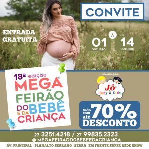 A 18º edição do Mega Feirão vai até o dia 14 de outubro, na loja Jô Baby Kids de Planalto Serrano, em frente ao supermercado Rede Show na avenida principal do bairro. Funcionará de 10h às 20h de segunda a sábado, e domingo de 10h às 18h. Mais informações nos tels 3251-4218 ou 99835-2323 e na página do evento no facebook onde será realizado o sorteio.