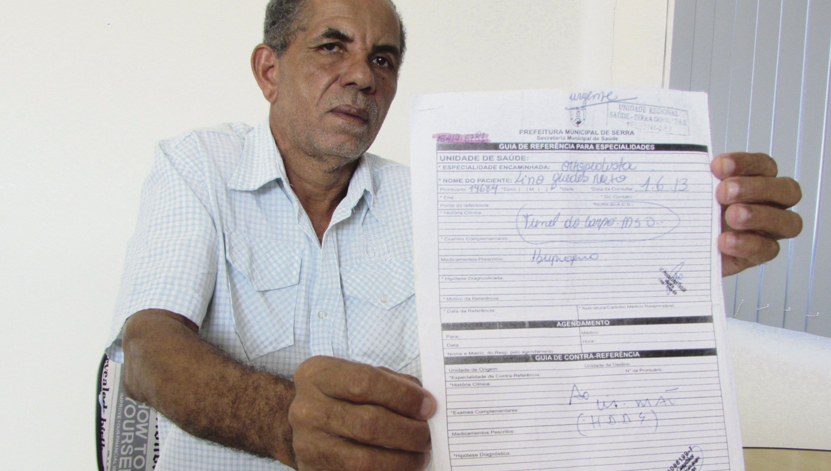 Lino Guedes Neto, morador de Nova Almeida, diz que tenta há três anos na unidade de saúde do bairro um encaminhamento para consulta com um especialista. “Em 2013 meu braço direito começou a perder mobilidade. De lá para cá só vem piorando. Já não consigo levantar o braço e está cada vez mais difícil fazer tarefas do dia a dia. O pior é que atuo como pedreiro, pintor, eletricista e não posso mais trabalhar”, lamenta.