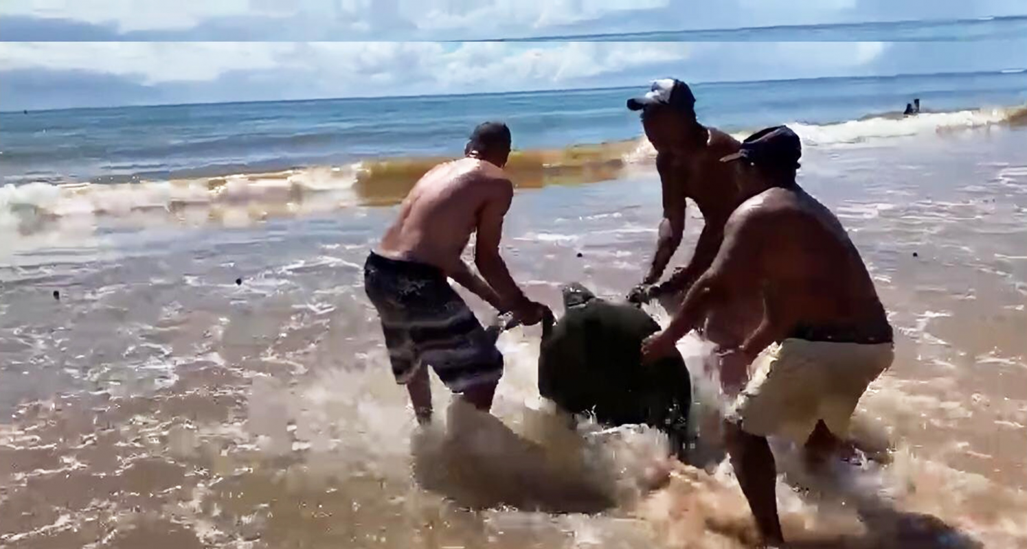 A soltura de uma tartaruga chamou a atenção de banhistas e moradores nesta quarta-feira (13), em Manguinhos, na Serra. O réptil foi capturado por engano enquanto pescadores do balneário lançavam rede de arrasto no mar. Os ‘responsáveis’ pela captura incidental não pensaram duas vezes e a libertaram no mar novamente. A atitude ganhou repercussão na comunidade, já que tudo foi gravado e compartilhado nas redes sociais.