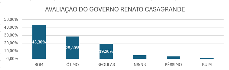 Em relação ao governador Renato Casagrande, 43,3% avaliam seu governo como bom, 28,5% como ótimo, 19,2% como regular, 3,1% como péssimo e 1,3% como ruim.