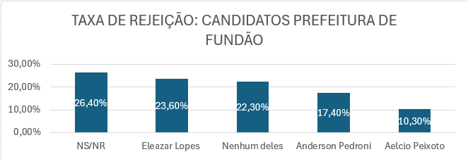 O candidato Eleazar Lopes apresentou a maior taxa de rejeição, com 23,6%, seguido por Anderson Pedroni, com 17,4%, e Aélcio Peixoto, com 10,3%. A maioria dos entrevistados avalia o mandato do atual prefeito, o advogado Gilmar de Souza Borges, como regular (28,7%), seguido por péssimo (25,9%) e bom (22,8%). Apenas 10,3% avaliam como ruim e o mesmo percentual considera o mandato ótimo.