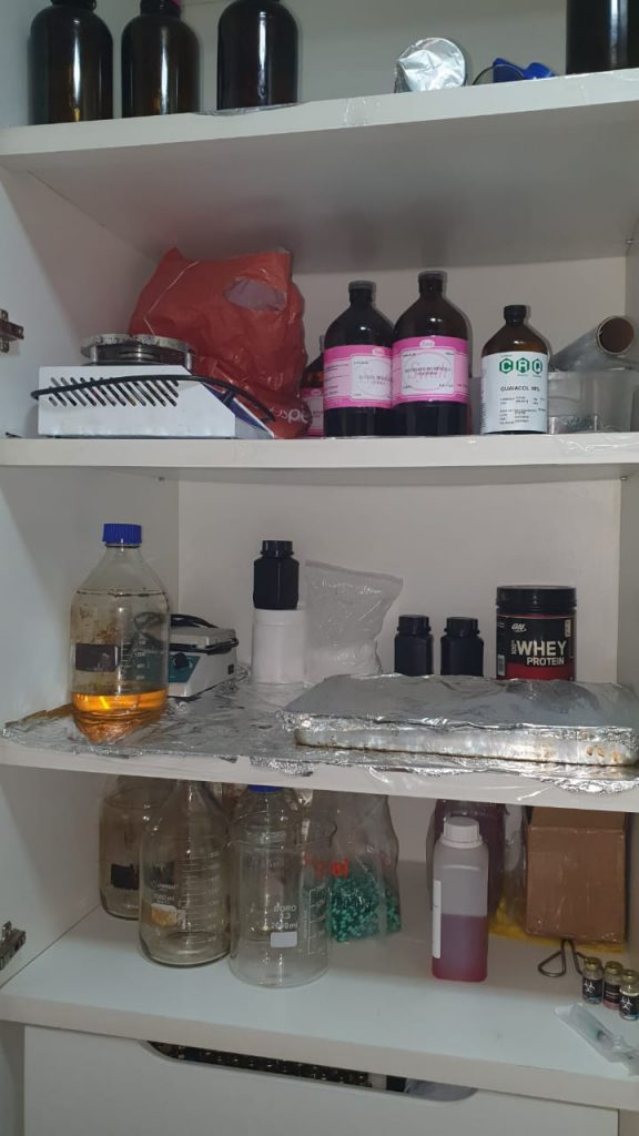 Durante a busca dos investigados, foi encontrado um laboratório de produção destes medicamentos ilegais, na Serra. Entretanto, a PF não citou o nome do bairro. Foram apreendidos vários insumos, recipientes e apetrechos para a produção, bem como anabolizantes provenientes de outros países (China e Paraguai) sem a autorização da ANVISA.