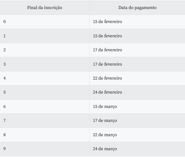 Trabalhadores do setor privado, inscritos no PIS, receberão o abono salarial deste ano no período de 8 de fevereiro a 31 de março, pela Caixa. Para servidores públicos, militares e empregados de estatais, inscritos no Pasep, o pagamento vai de 15 de fevereiro a 24 de março, pelo Banco do Brasil.