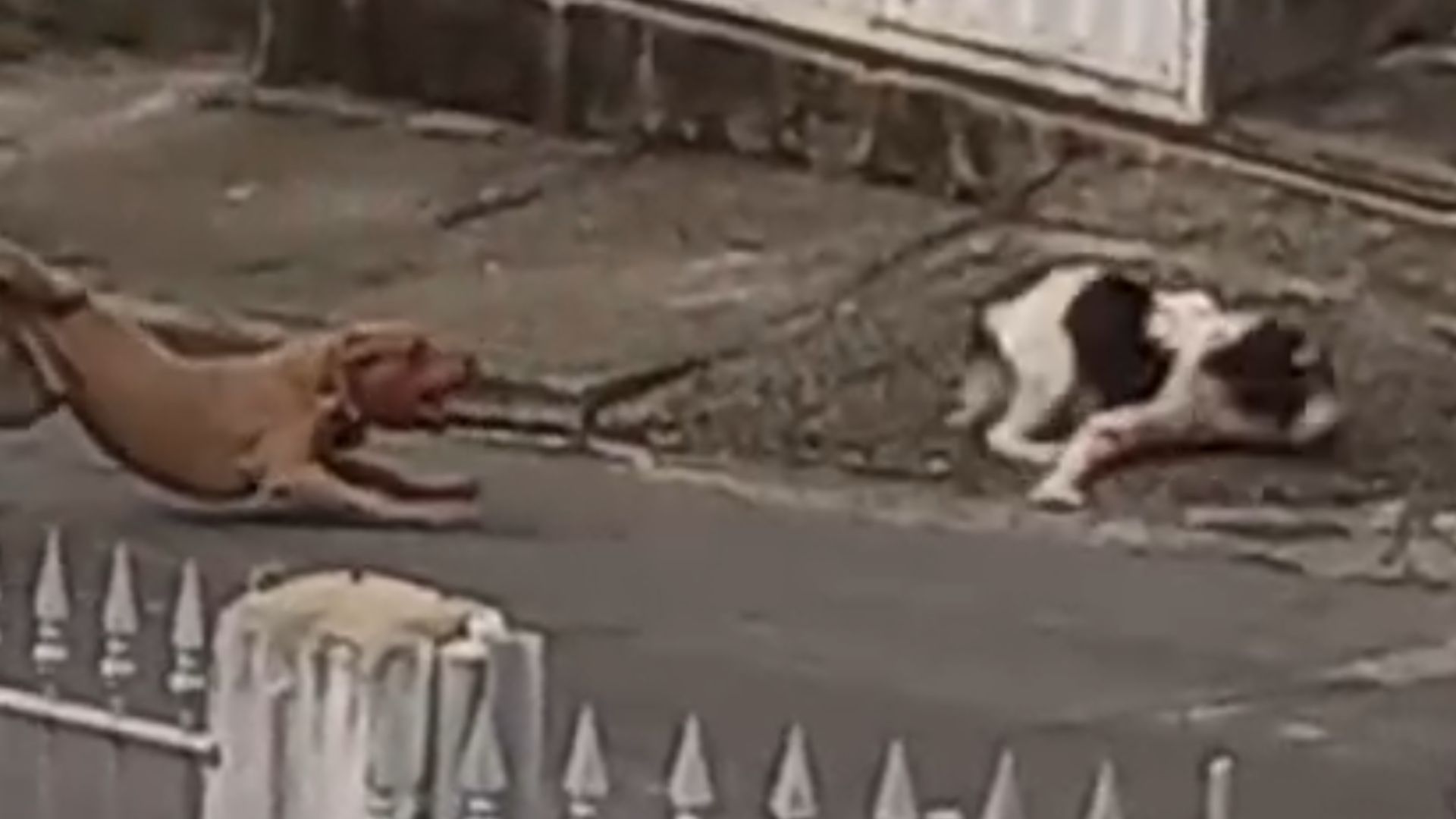 Rosa, que é dona do cachorro atacado, aparece no vídeo tentando separar os cachorros com uma mangueira, com o portão de sua casa aberto.