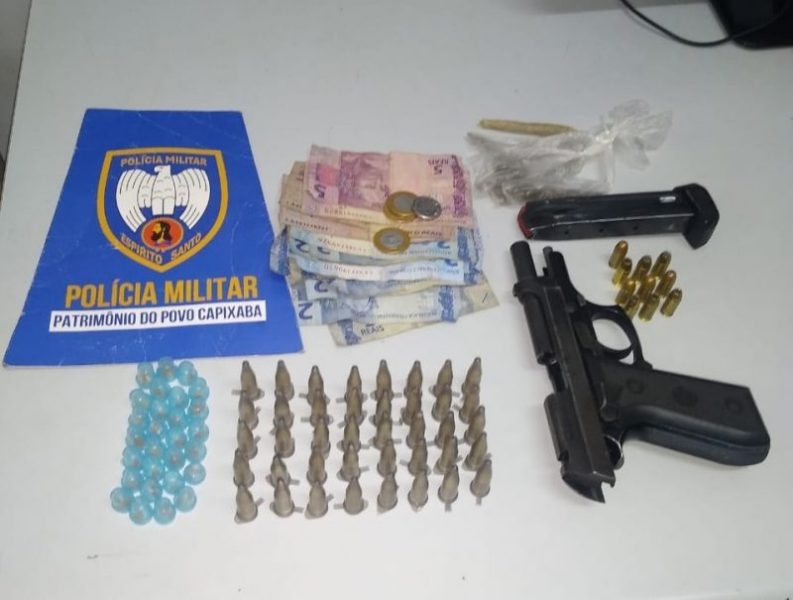 Na madrugada desta terça-feira (10), policiais militares do 6º Batalhão detiveram dois indivíduos e apreenderam uma pistola calibre 380 com 10 munições, 28 pedras de crack, 40 pinos de cocaína, quatro buchas e um cigarro de maconha, além de dois aparelhos celulares e R$49,50 em espécie. Os militares faziam patrulhamento no bairro Planalto Serrano, na Serra, quando avistaram os indivíduos em atitude suspeita.
