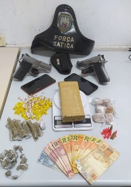Em uma apreensão, durante a averiguação de denúncias anônimas no bairro Eldorado, a polícia abordou dois suspeitos e com eles encontraram duas pistolas calibre 380, 23 munições do mesmo calibre, um tablete de maconha e vasta quantidade de entorpecente já fracionado, além de R$860,00 em espécie.