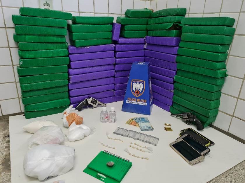 Nas buscas foi encontrada uma mochila contendo duas armas de fogo, sendo um revólver calibre 38 e um revólver calibre 32, além disso, também foram encontrados e apreendidos vários tabletes de maconha totalizando 70 kg da substância, bem como 1,5 kg de cocaína, 25 pedras de crack, quatro munições e material para preparo de entorpecentes.