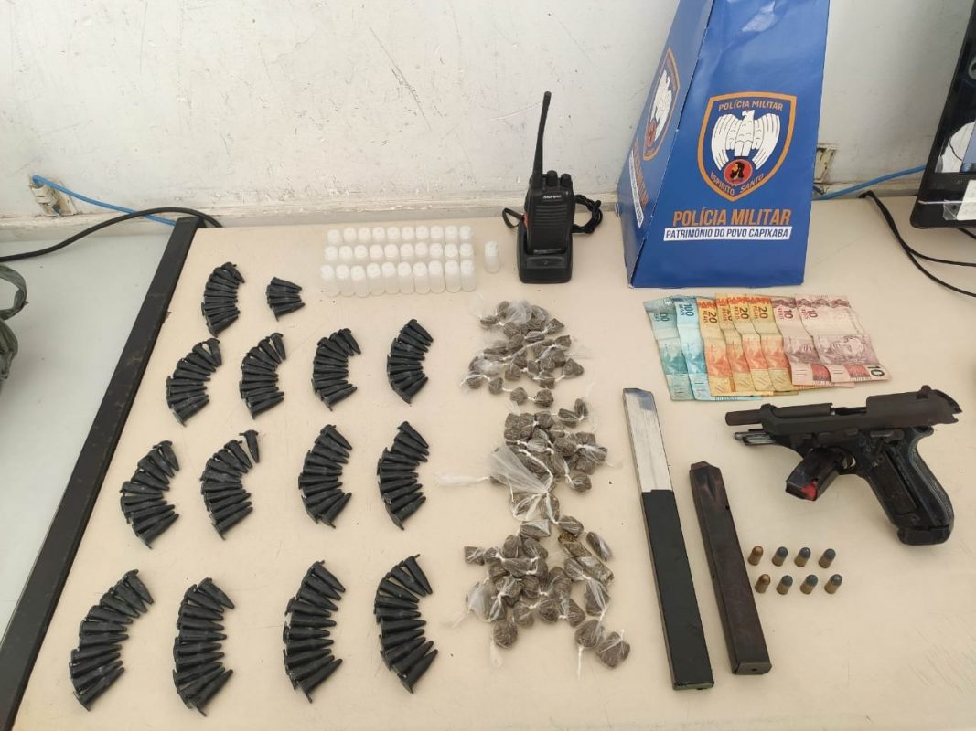 Foram feitas buscas e os policiais encontraram uma pistola e três carregadores calibre .380, 135 pinos de cocaína, 88 buchas de maconha, 31 frascos de loló, um rádio comunicador e R$300,00 em espécie.