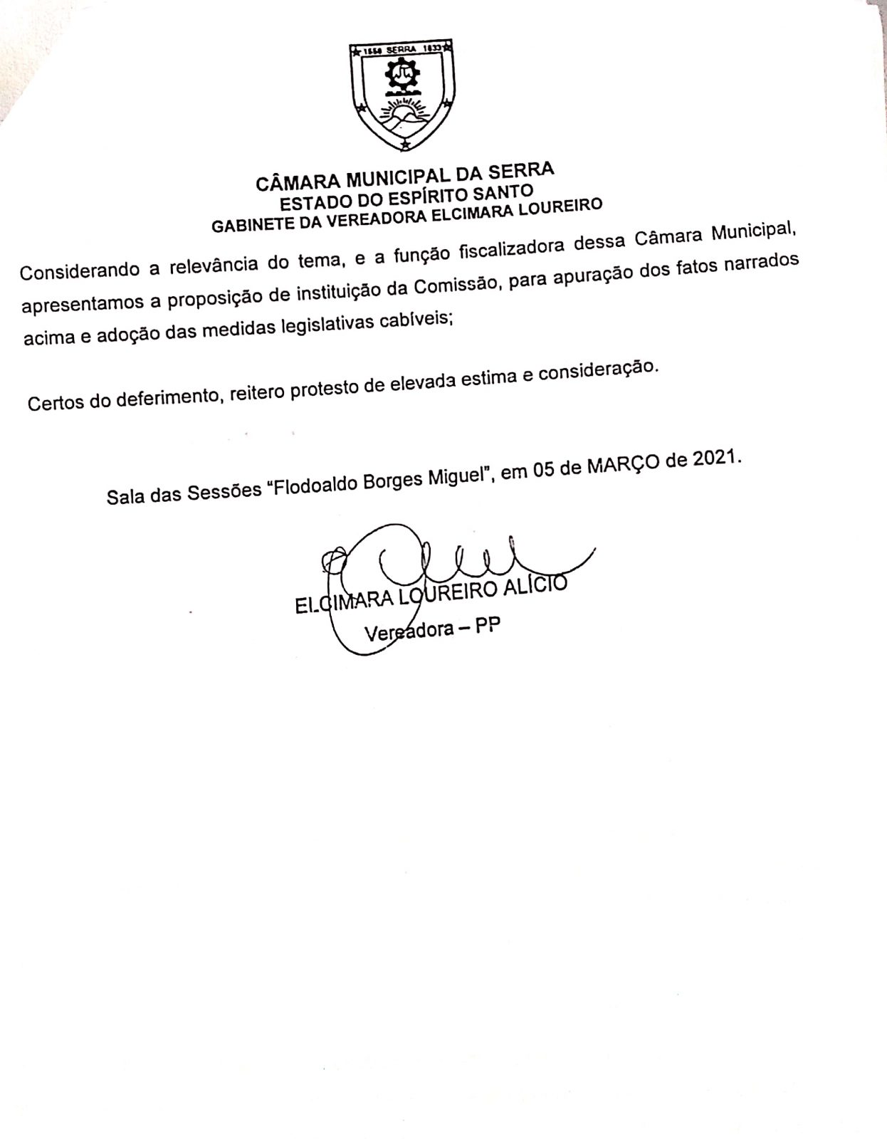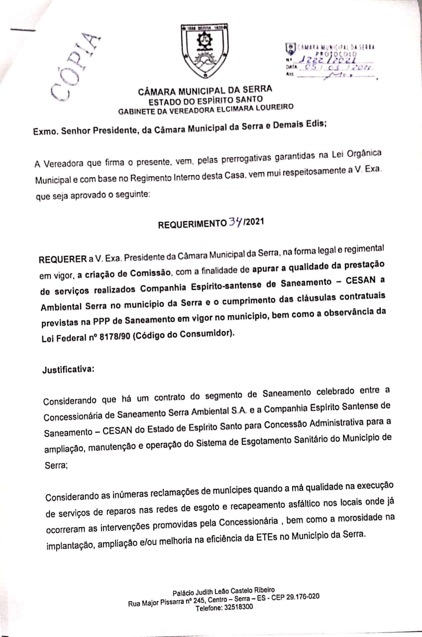 “O Requerimento solicita a instauração de uma comissão especifica para monitorar e fiscalizar os serviços da Cesan e Ambiental Serra que é a responsável pelo saneamento básico na cidade. A intenção é ouvir relatos, constatar in loco as condições dos serviços, produzir relatórios e encaminhar para gestão municipal. Queremos que sejam tomadas as medidas necessárias, inclusive, com possíveis encaminhamentos para o Ministério Público, queremos providências”, disse Elcimara.