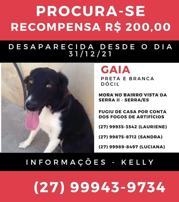 Gaia é dócil e nunca havia fugido de casa. Sua pelagem é preta e branca e ela é da raça Border Collie. A família oferece recompensa de R$ 200 para quem a encontrar e devolvê-la a seu lar.