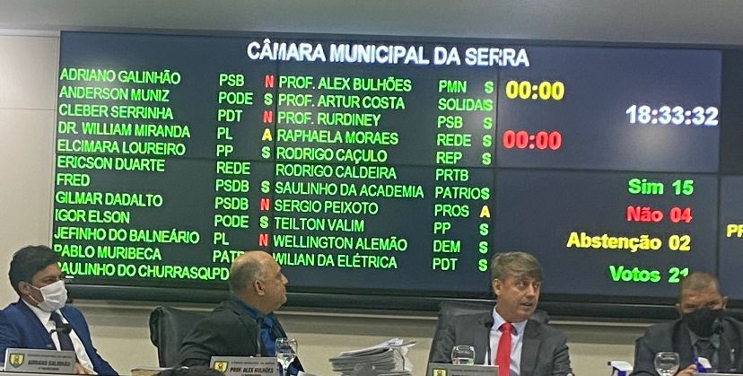Votaram contra: Adriano Galinhão (PSB), Cleber Serrinha (PDT), Gilmar Dadalto (PSDB) e Jefinho do Balneário (PL).
