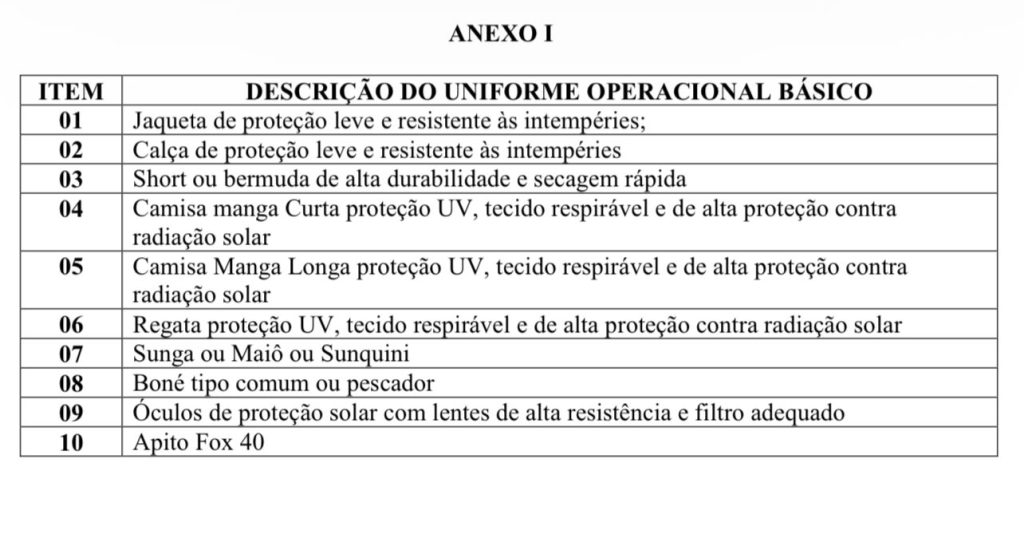 Segundo a proposta, os Guarda-Vidas Municipais e os Salva-Vidas serão obrigados a adquirir, com tal verba, as peças que compõem o uniforme dentro dos padrões estabelecidos, conforme tabela ao final desta matéria. O texto também determina que os agentes sempre se apresentem para o serviço com uniforme completo e em bom estado (não desbotado, com costuras perfeitas etc.).