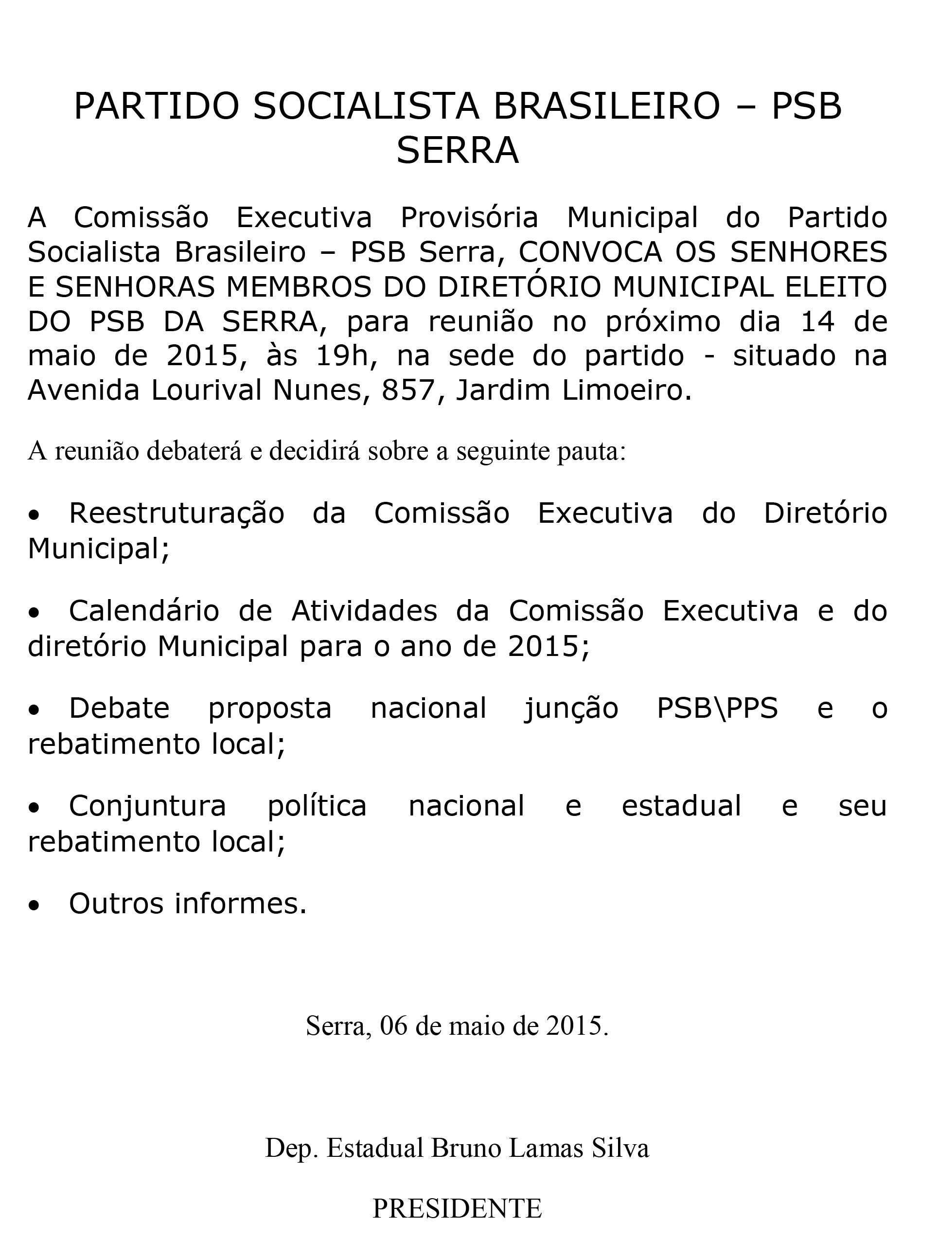 Membros do Diretório municipal eleito do PSB da Serra se reúnem no próximo dia 14 para uma reunião. Na pauta, reestruturação da Comissão Executiva, discussão do calendário de atividades para 2015, debate da proposta de fusão PSB/PPS e análise das conjunturas nacional e local. O encontro será realizado às 19h, na sede do partido, localizada à Avenida Lourival Nunes, 857, em Jardim Limoeiro.