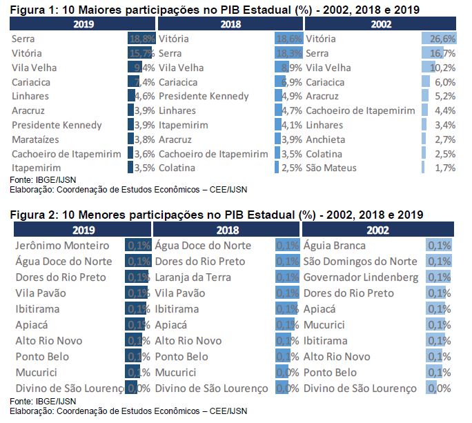 Os resultados do PIB dos Municípios de 2019 revelam que os quatro municípios que apresentaram maior participação no PIB Estadual situam-se na Região Metropolitana da Grande Vitória, sendo, pela ordem, Serra, Vitória, Vila Velha e Cariacica. O estudo mostra ainda que eles respondem por pouco mais da metade da produção econômica do Estado (51,4%). Essa concentração da economia, contudo, vem se reduzindo quando comparados com os resultados de 2002, quando esses mesmos municípios concentravam 59,4% do PIB.