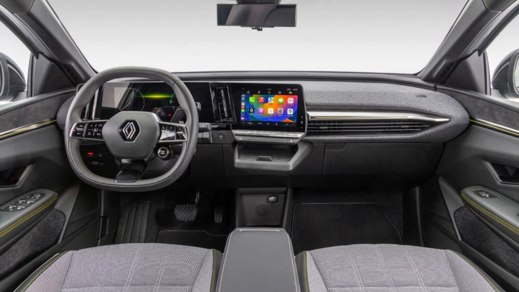 A Renault aposta em materiais sustentáveis no acabamento do veículo. Grande parte do revestimento interno utiliza tecidos reciclados e plásticos reaproveitados, sem abrir mão de sofisticação e conforto. O espaço interno é otimizado pela ausência do túnel central, característica típica de modelos projetados desde a origem como elétricos.