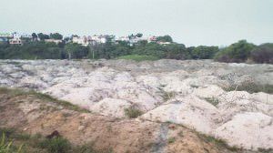 Vários montes de resíduos numa área de preservação entre os rios e manguezais formados pelas águas das lagoas Juara e Jacuném. Este é o resultado da dragagem do rio Jacaraípe. Essa paisagem ‘lunar’ pode ser vista por quem passa em frente ao trevo de acesso à Serra-sede no contorno de Jacaraípe.