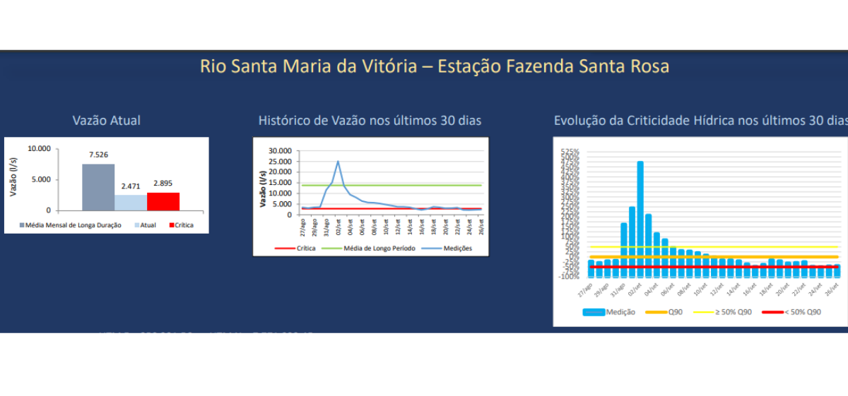 O histórico de volume médio de captação nesse período do ano é de 7.5 mil litros por segundo, mas atualmente a vazão do rio é de 2.471 litros por segundo. O valor crítico, ou seja, aquele considerado um sinal de alerta para a baixa vazão, é de 2.895 litros por segundo. Essa é o pior nível de vazão desde o dia 27 de agosto, que é a última data que a AGERH divulga no relatório de Evolução da Criticidade Hídrica.