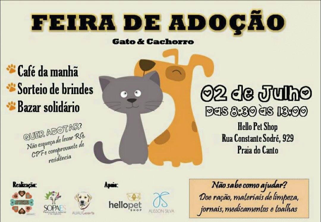 Neste sábado – dia 2 de julho – tem feira de adoção de cães e gatos na Praia do Canto, em Vitória. O evento será realizado na Hello Pet Shop, das 8h30 às 13 horas.