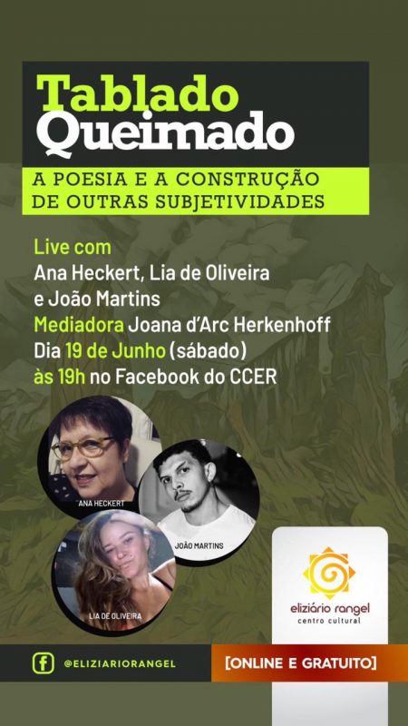 Já às 19 horas, acontece o projeto Tablado Queimado, cujo tema deste mês será ‘A Poesia e a construção de outras subjetividades’. A live terá como palestrantes, a poetisa Lia de Oliveira e o poeta João Martins que junto à psicóloga Ana Heckert vão debater a poesia e a construção de outras subjetividades.