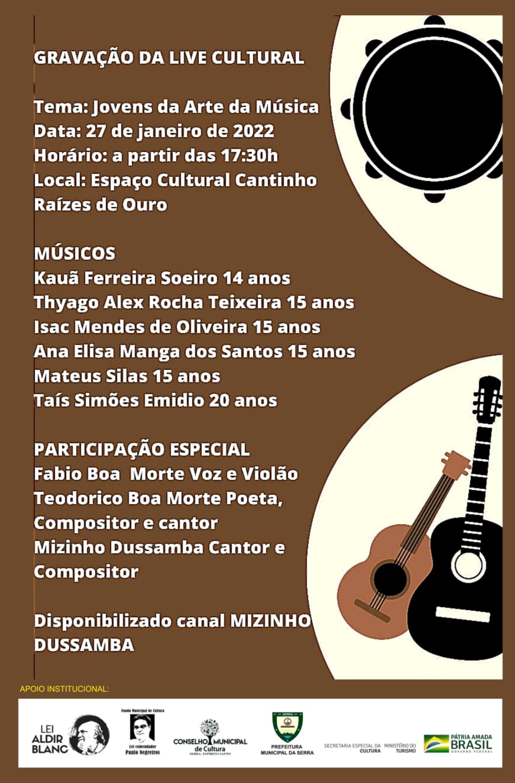 Além deles vai ter participam especial do poeta Teodorico Boa Morte, que vai cantar e tocar na voz e violão e do cantor e compositor Mizinho Dussamba.
