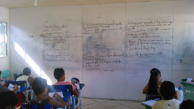 Além de estar sem quadro, não tem forro, a fiação foi arrancada em alguns pontos, as paredes estão pichadas e há outros problemas: O espaço onde está funcionando a escola é frequentemente invadida à noite por pessoas que furtam fios, contam pais e professores.