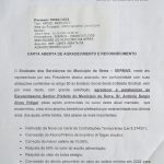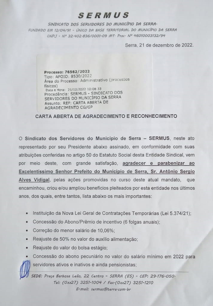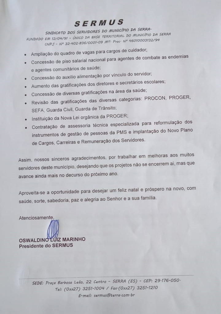 Ao fim de mais um ano, o presidente do Sindicato dos Servidores da Serra – SERMUS, Oswaldinho Luiz Marinho, aproveita para agradecer ao prefeito Sérgio Vidigal, pela adoção de inúmeras medidas em favor do funcionalismo municipal, medidas essas que o SERMUS vem pleiteando junto ao poder público ao longo dos anos e, finalmente adotadas pelo Executivo ao no período de dois anos de mandato do prefeito Vidigal.