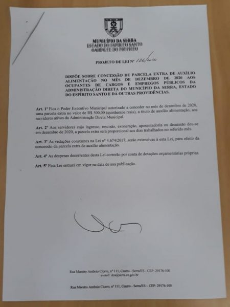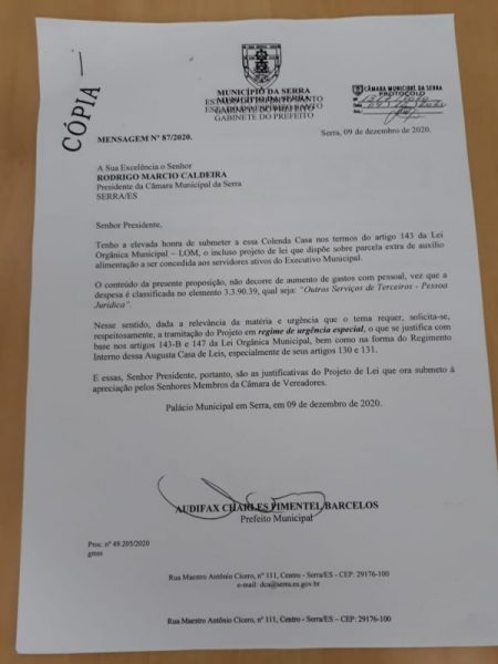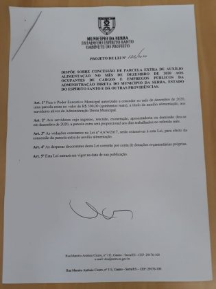 A PL diz enviado pelo prefeito Audifax diz que “fica o Poder Executivo autorizado a conceder no mês de dezembro de 2020, uma parcela extra no valor de R$ 500, a título de auxílio alimentação, aos servidores ativos da Administração Direta Municipal”.