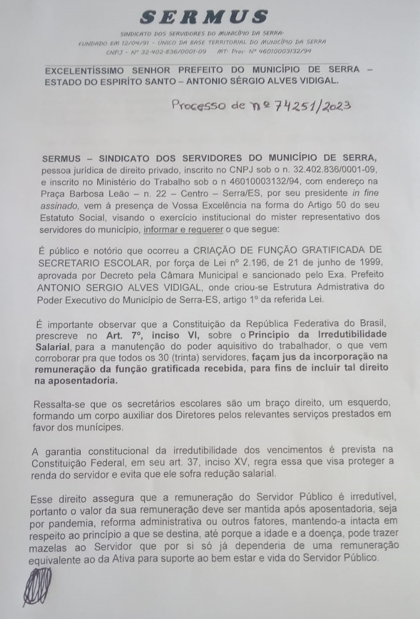 O Sindicato dos Servidores do Município da Serra (SERMUS) tomou uma importante iniciativa em busca de melhores condições de trabalho para os secretários escolares da região. Recentemente, o sindicato protocolou um pedido junto à Prefeitura da Serra para a criação de uma função gratificada para esses profissionais. Esta ação é amparada pela Lei n° 2.196, de 21 de junho de 1999, que estabeleceu a Estrutura Administrativa do Poder Executivo do Município de Serra-ES, conforme o artigo 1° da referida lei.