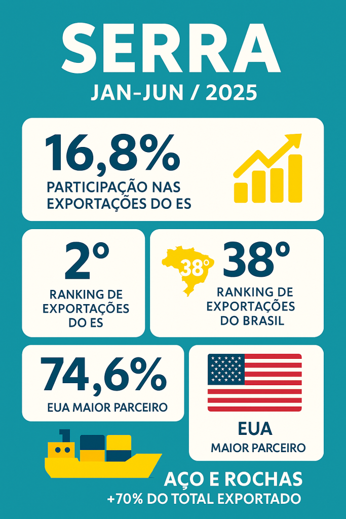 Entre janeiro e junho de 2025, a Serra exportou US$ 849,17 milhões em produtos, mantendo-se como a segunda maior exportadora do Espírito Santo, com 16,8% de participação nas exportações estaduais. No cenário nacional, o município aparece na 38ª colocação entre os principais exportadores do Brasil, respondendo por 0,5% do total exportado pelo país.