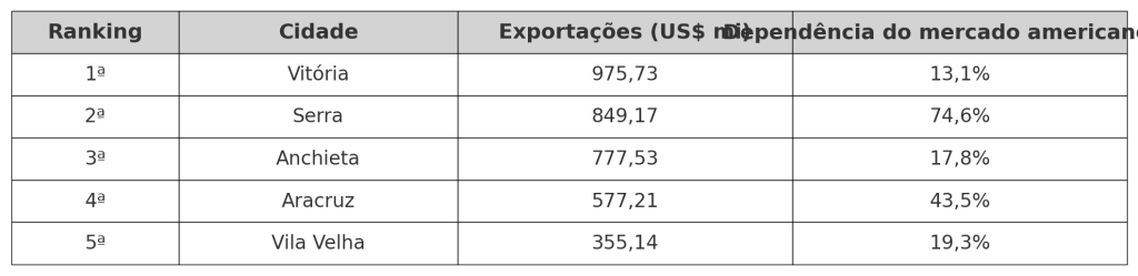 Vitória registrou US$ 975,73 milhões em exportações no período, uma leve vantagem em relação aos US$ 849,17 milhões exportados pela Serra. No entanto, o perfil das mercadorias e o grau de dependência em relação ao mercado norte-americano fazem com que a cidade da Serra esteja em situação mais sensível.